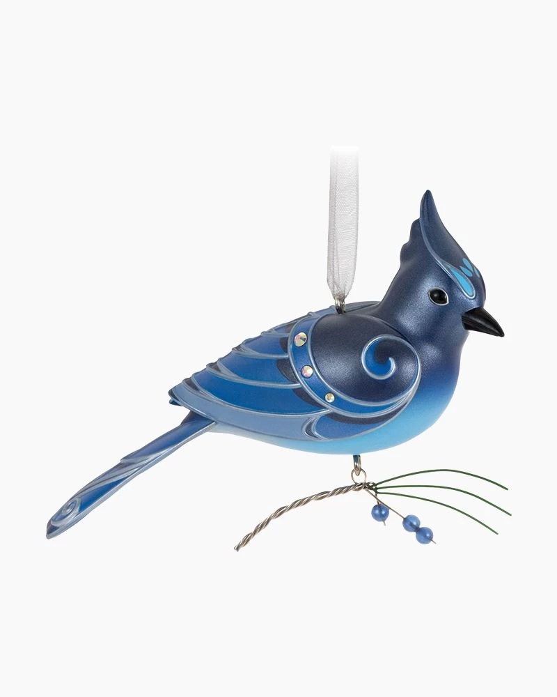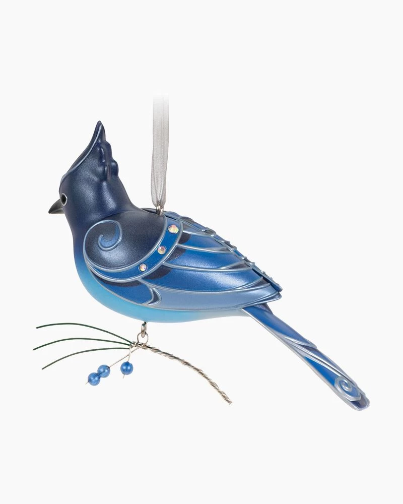 Add nature’s splendor to your holiday celebrations with this handsome Steller’s Jay Christmas tree ornament. Gem details and metallic silver embellishments pair with a dangling juniper branch, sure to delight bird enthusiasts.