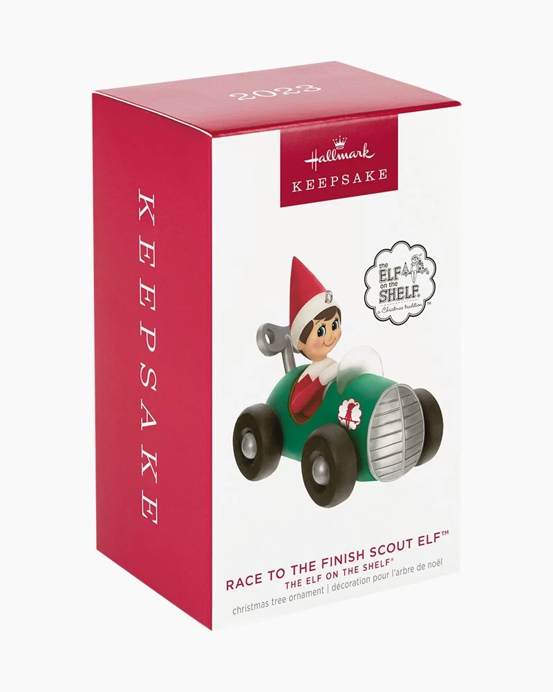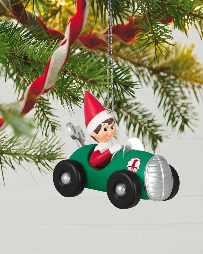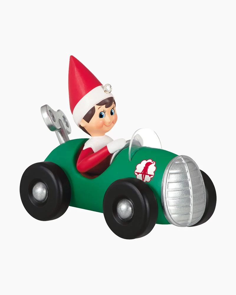 One of Santa’s Scout Elves is ready to report back to the big guy…after he finishes the big race! Fans of the popular The Elf on the Shelf tradition will love to display this festive fellow sitting behind the wheel of his derby car. Celebrate a beloved family tradition – even if all the believers have grown up – with this fun Christmas tree ornament.