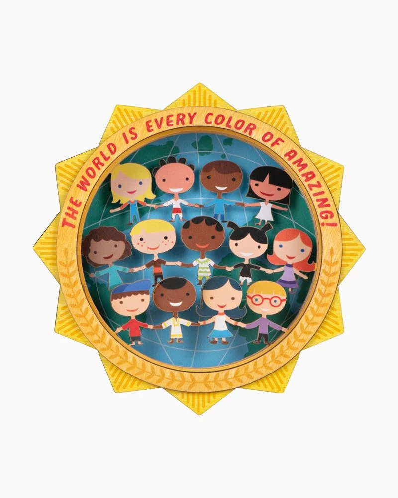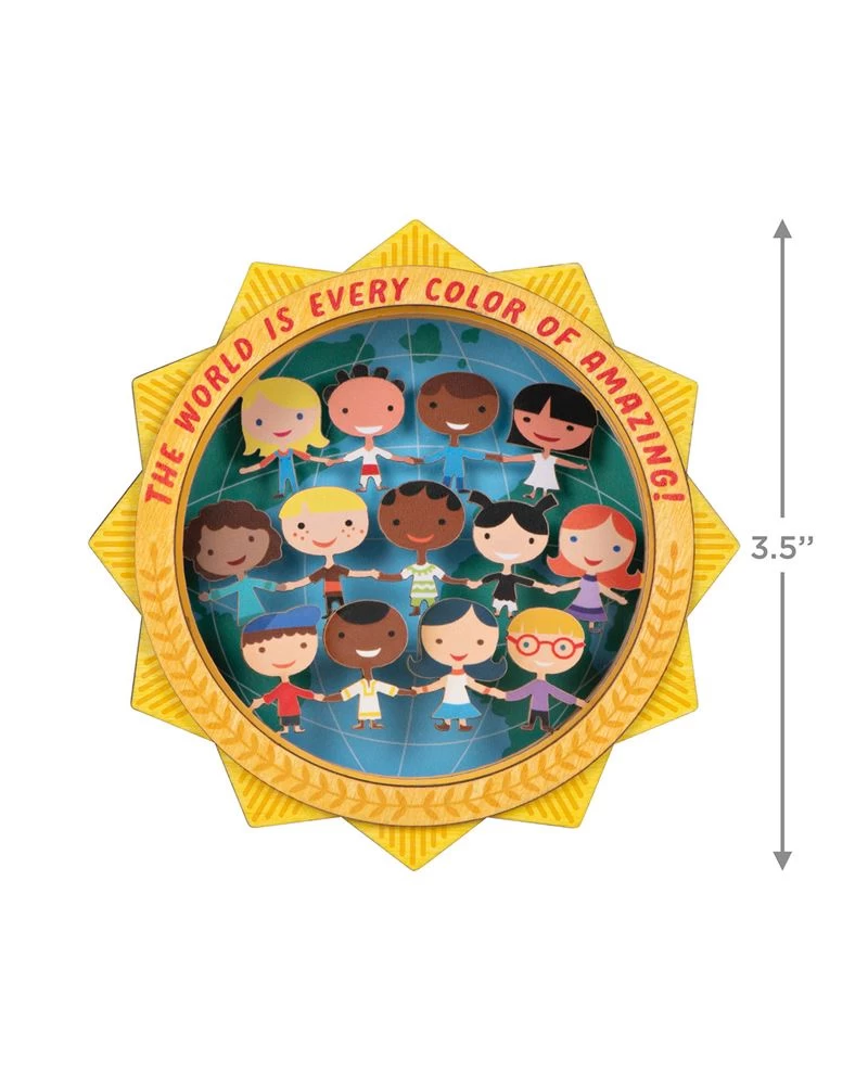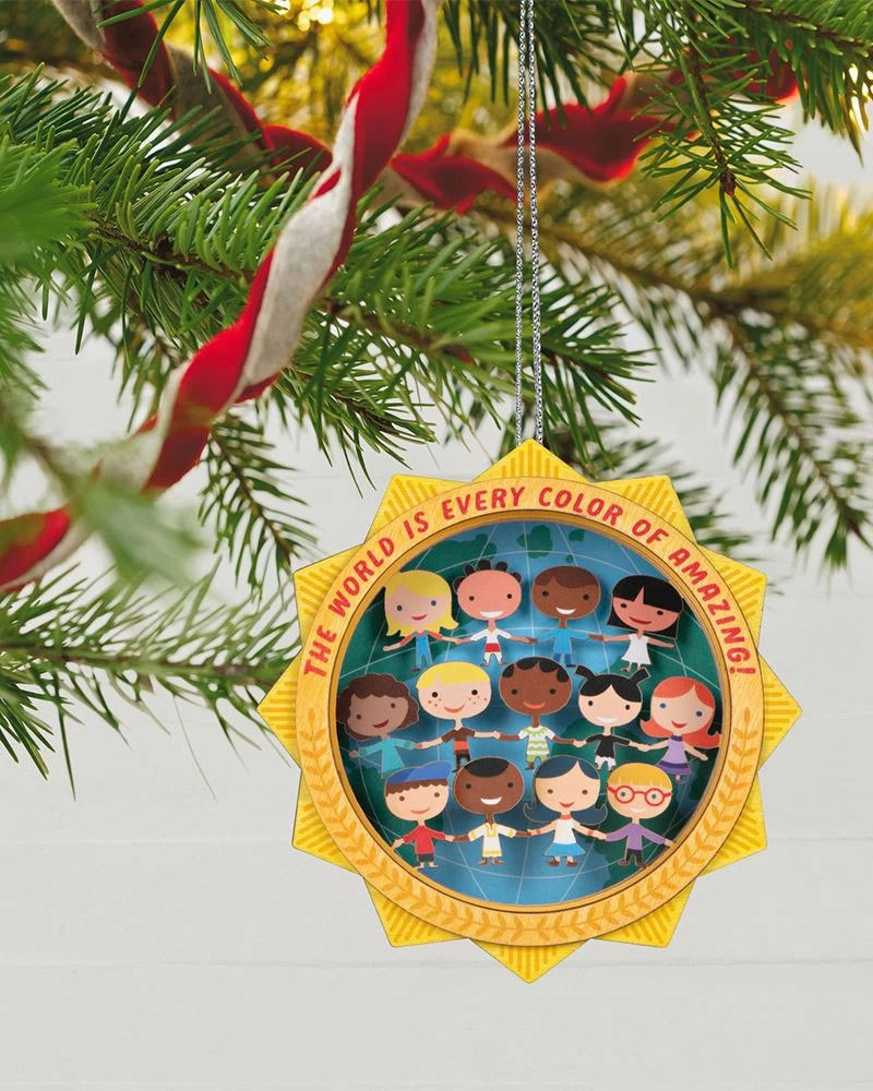 Share a message of joy with this colorful UNICEF Christmas tree ornament. A vibrant laser-cut wood sun frames an intricate papercraft scene of children from around the world holding hands in front of a globe background. A portion of the proceeds from this UNICEF ornament purchase helps save and protect the world’s most vulnerable children.