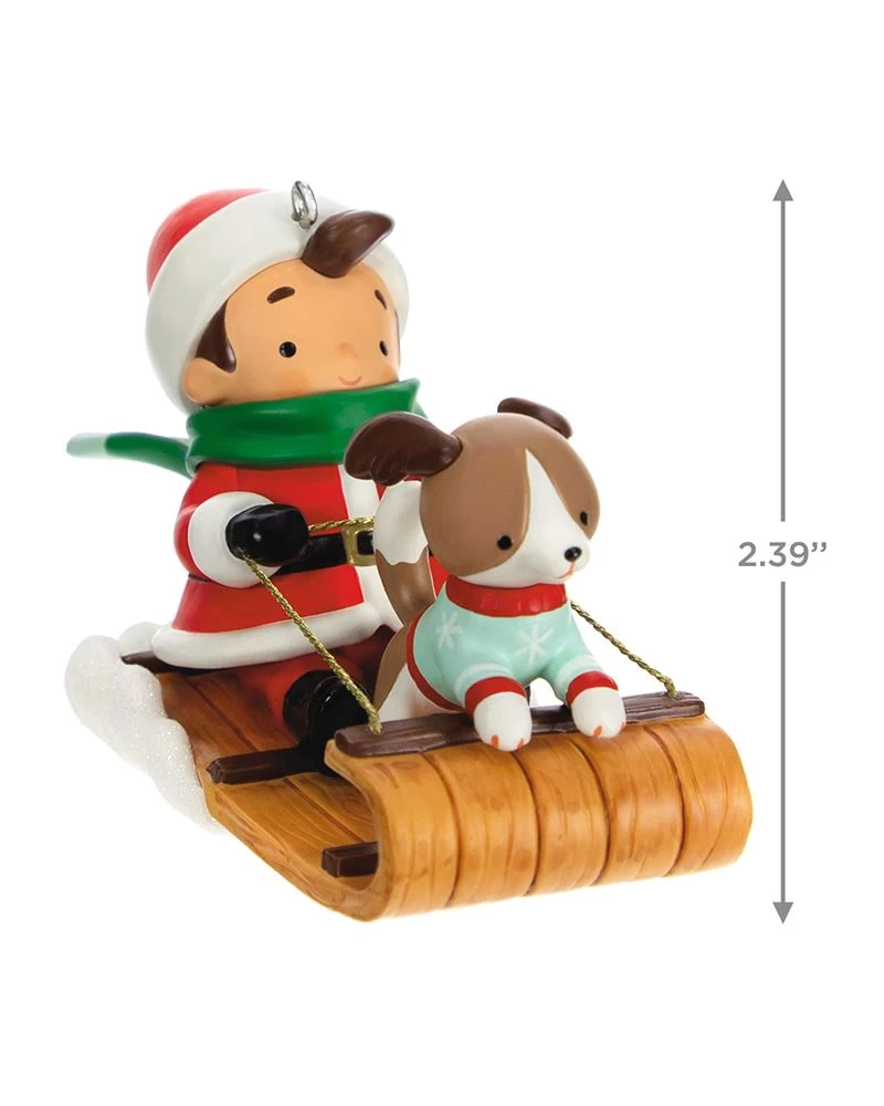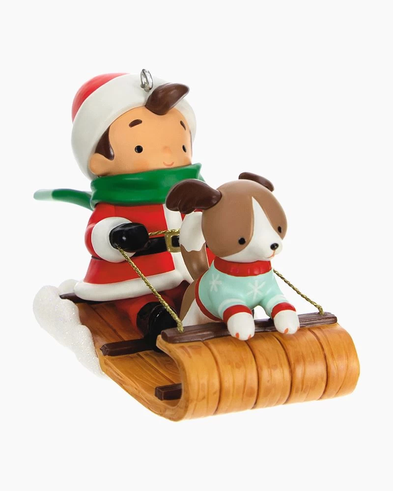 What was Santa Claus like before he grew into the jolly old elf we all know and love today? This cute Christmas tree ornament gives a glimpse at Young Santa and his puppy dog pal enjoying the iconic pastimes of children like sledding on a snow day!